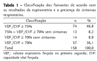 A idade média dos fumantes foi 55 ± 8,5 anos e 62,7% deles eram do sexo feminino. Na Tabela 1, está apresentada a classificação dos fumantes de acordo com os resultados da espirometria pós-broncodilatador e a presença ou ausência de sintomas respiratórios. Entre os 158 participantes do programa, 57 (36,1%) preenchiam os critérios diagnósticos para DPOC e 14 (8,9%) foram considerados em risco para o desenvolvimento da doença. Do total de fumantes com diagnóstico de DPOC, apenas 18 (31,6%) tinham diagnóstico prévio da doença. Por outro lado, em 7 (28%) dos fumantes o diagnóstico prévio de DPOC não foi confirmado pela espirometria. Treze indivíduos (8,2%) apresentaram 75% > VEF1/CVF = 70%; entretanto, não referiam sintomas respiratórios.
