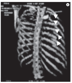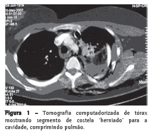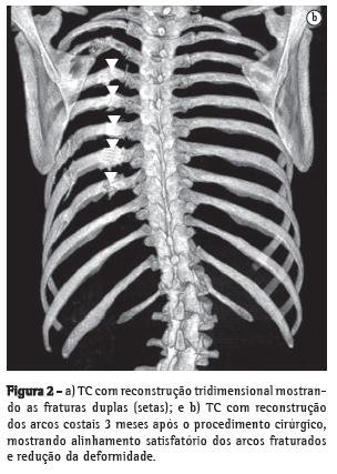 Paciente do sexo feminino, 32 anos, vítima de acidente automobilístico, que ocasionou hemopneumotórax esquerdo, contusão pulmonar esquerda e fraturas duplas do terceiro ao oitavo arcos costais esquerdos, evidenciados na radiografia e tomografias computadorizadas (TC) do tórax (Figuras 1 e 2). As tomografias de crânio, coluna cervical, abdômen e pelve apresentaram-se normais, assim como eletrocardiograma, ecocardiograma, enzimas musculares e marcadores de necrose miocárdica. Foi realizada drenagem torácica fechada em selo d'água e solicitada a instalação de cateter epidural para analgesia contínua com bomba de infusão. A paciente apresentava deformidade torácica importante e dor, apesar de doses elevadas de analgésicos. Antecipou-se que o quadro, se não tratado cirurgicamente, evoluiria para deformidade complexa da parede, com possível acometimento da respiração. Não necessitou de ventilação mecânica. Em vista desse quadro clínico, foi decidido o tratamento cirúrgico para estabilização das fraturas. O procedimento foi realizado por toracotomia póstero-lateral esquerda. Foram encontradas fraturas duplas do terceiro ao oitavo arcos costais esquerdos com ruptura completa de vários pedículos intercostais, herniação e impactação do segmento fraturado (6 arcos) para o interior da cavidade pleural, com compressão importante do parênquima pulmonar (toracoplastia traumática). Foi realizada redução das fraturas e fixação das costelas com fios de aço número 5, perfurando as extremidades das costelas com broca número 2, passando-se o fio de um segmento de costela para outro e amarrando-se o fio de aço. Foi colocado um dreno de tórax, que foi retirado no terceiro dia. A paciente evoluiu com excelente controle da dor e melhora na dinâmica ventilatória. A radiografia e a tomografia no pós-operatório confirmam o bom resultado do tratamento cirúrgico. (Figura 3).