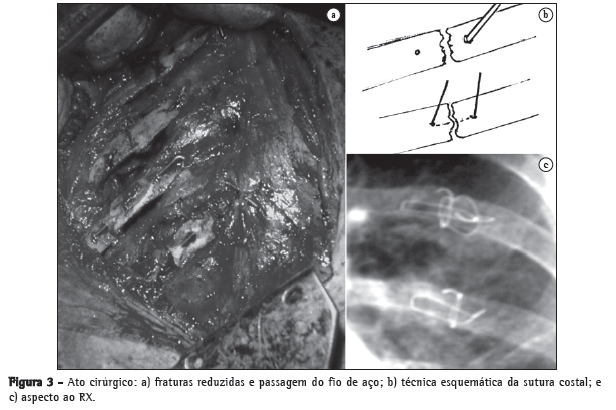 Outros autores(5) mostraram melhores resultados em termos de tempo de internação e de evolução clínica, no grupo operado, quando comparado ao tratado clinicamente, com médias de internação de 9 e 21 dias, e mortalidade de 85 e 29%, respectivamente. Isto favorece amplamente o grupo cirúrgico. Apesar disso, a indicação de cirurgia nesses pacientes continua controversa. Geralmente, quando indicado, o tratamento cirúrgico visa evitar deformidades acentuadas da parede torácica e, com isto, prevenir a ocorrência de dor crônica e insuficiência respiratória de difícil controle, no futuro. Essas últimas foram as indicações consideradas para fixação cirúrgica das fraturas, no caso aqui apresentado.