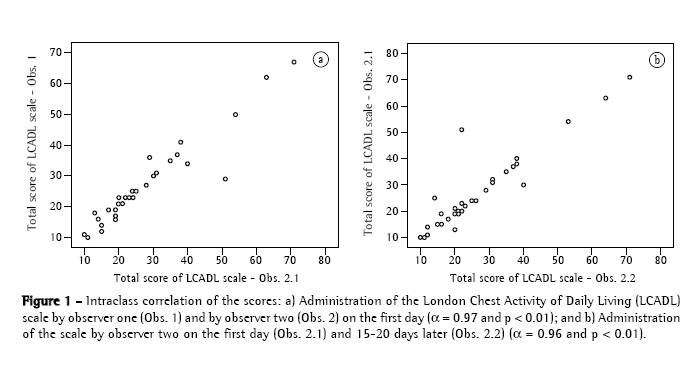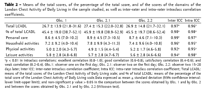 The volunteers were assessed for prebronchodilator and postbronchodilator pulmonary function using a previously calibrated Multispiro spirometer (SX/PC; Creative Biomedics, San Clemente, CA, USA), in accordance with the guidelines established by the Brazilian Thoracic Society.(15) Oxygen saturation was also measured, using an Ohmeda pulse oximeter (Biox 3700; Ohmeda, Boulder, CO, USA), after the patients had rested for 15 min. On the same day, the patients performed two 6MWTs, after which the LCADL scale was administered. At the study outset, the scale was administered to the patients (twice in one day) by two observers (Obs. 1 and Obs. 2.1). The order of administration was always the same: first, the scale was administered by Obs. 1 and, 10 min later, it was administered by Obs. 2.1. The scale was administered again, 15-20 days later, by the second observer (Obs. 2.2). On the second day of administration of the scale, the patients completed a brief questionnaire comparing current symptoms (cough, volume and color of secreted expectoration, as well as dyspnea) with those reported at the study outset. If there were any changes (in the symptoms or in the type/dose of medication used), a second spirometric test was performed on the second day. None of the patients in the sample presented any such changes in the symptoms or in the medication used between the two study days.
