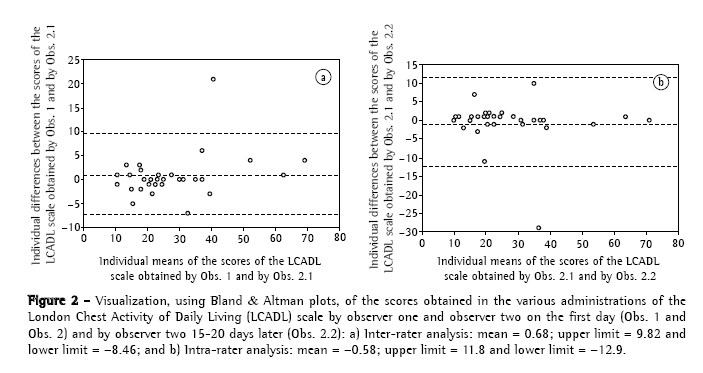 The evaluation of the inter-rater reliability of the total score revealed an ICC of 0.97, which shows excellent reliability. In the intra-rater analysis, the ICC presented a value similar to that found by Garrod et al. (2002),(10) who, in analyzing the reproducibility of the LCADL scale in nineteen ­individuals, also obtained excellent reliability (α = 0.96).(21) The inter-rater and intra-rater agreement for the various administrations of the scale was confirmed using Bland & Altman plots. However, the upper and lower limits of the inter-rater and intra-rater analyses were relatively high, considering that the maximum score is 75 points. Nevertheless, this does not represent a tendency of the sample as a whole since only one patient presented considerable discrepancies among the scores obtained at the three time points at which the scale was administered (30, 51, and 22 points, respectively). The high values of the differences among the various administrations (inter-rater difference of 21 points and intra-rater difference of 29 points) for this patient (age, 57 years; body mass index, 20 kg/m2; FEV1, 36% of predicted) might have been responsible for increasing the 95% CI of the sample.
