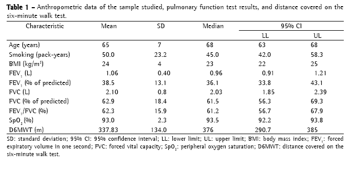 A total of thirty-one individuals diagnosed with severe COPD and treated at the Vale do Itajaí University Physical Therapy Clinic in the city of Itajaí, located in the state of Santa Catarina, Brazil, were included in the study. The inclusion criteria were having been diagnosed with severe COPD, in accordance with the criteria of the Global Initiative for Chronic Obstructive Lung Disease (GOLD),(1) and clinical stability for the four weeks preceding the study outset. The exclusion criteria were as follows: presenting other nonpulmonary diseases that are considered disabling, severe, or difficult-to-control; presenting exacerbation during the study period; being incapable of understanding the scale; and being unable to perform the 6MWT.