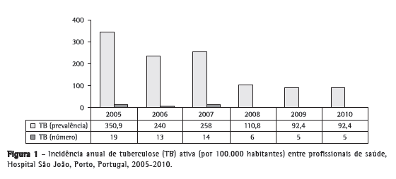 Em nosso estudo, a distribuição de casos de TB ativa não foi uniforme ao longo dos anos, sendo que o número máximo de casos foi 19 (equivalente a 351/100.000 habitantes) em 2005, ao passo que a incidência na população geral da cidade do Porto foi de apenas 45,4/100.000 habitantes em 2006.(27) Após a implementação do programa de rastreamento no hospital estudado, houve significativa redução do número de novos casos de TB ativa entre PS. Tanto em 2009 como em 2010, houve apenas 5 casos (o equivalente a 93/100.000 habitantes), menos de um terço da incidência em 2005, embora ainda três vezes maior que a incidência relatada para a população geral da área (33,7/100.000 habitantes) em 2009.(9) A redução do número de casos de TB ativa em PS entre 2005 e 2010 provavelmente reflete os esforços empenhados para identificar populações de risco e tratar PS que recentemente adquiriram ITBL e nos quais se considera que haja alto risco de TB ativa, bem como a implementação de proteção individual eficaz e de programas educacionais para PS.