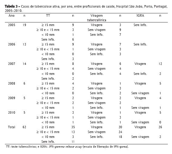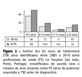 Em conclusão, a carga da TB em PS empregados em Portugal é elevada. Parece haver uma relação entre o tempo de exposição e o risco de TB, que é maior nos primeiros anos de exposição. A incidência de TB em médicos é semelhante àquela observada em enfermeiros. A sensibilidade do IGRA no momento do diagnóstico é superior a 90% em pacientes com TB ativa. Em países com elevada incidência, o rastreamento da TB é particularmente importante, pois pode identificar PS assintomáticos com ITBL ou TB ativa.