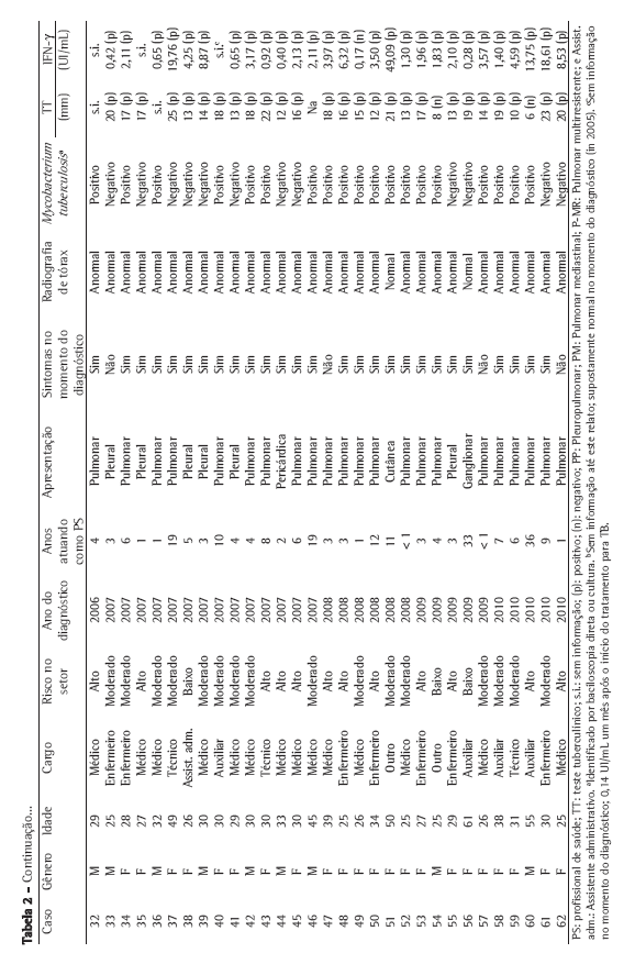 Os dados analisados neste estudo foram coletados como parte de um programa de rastreamento cujo objetivo foi identificar PS com infecção tuberculosa latente (ITBL) ou TB ativa. O rastreamento consistiu no seguinte: avaliação de sintomas respiratórios (tosse, escarro, hemoptise e dor torácica) e constitucionais (fadiga, anorexia, febre e hiper-hidrose); radiografia de tórax no momento da contratação, caso houvesse sintomas, e em PS que preenchessem os critérios para ITBL; e teste tuberculínico (TT) com 2 unidades tuberculínicas de PPD em 0,1 mL (RT23; Statens Serum Institut, Copenhague, Dinamarca), a menos que houvesse contraindicação (enduração prévia no TT ≥ 10 mm, diagnóstico prévio de TB com tratamento apropriado, infecção viral grave/imunização com vacina de vírus vivo no último mês, queimaduras extensas ou eczema). Desde 2007, o ELISA in vitro, baseado no IFN-gamma (IFN-) release assay (IGRA; QuantiFERON-TB Gold In-tube; Cellestis, Carnegie, Austrália), e o TT são realizados simultaneamente.