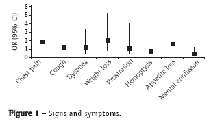 There was no predominance of either group in terms of clinical signs/symptoms, auscultatory findings, or prevalence of comorbidities. Although the odds ratios showed stronger correlations for certain variables (such as weight loss and mental confusion), the differences were not statistically significant (Table 2 and Figure 1).