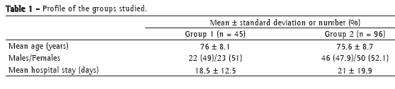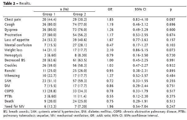 A total of 141 patients were selected and were divided into two groups: Group 1, comprising patients whose clinical criteria and radiological findings were suggestive of pneumonia; and Group 2, comprising patients in whom the radiological diagnosis did not corroborate the clinical hypothesis.