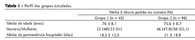 ResultadosQuarenta e cinco pacientes (31,9%) apresentaram radiografias compatíveis com a suspeita clínica de PNM e formaram o Grupo 1. A média de idade deste grupo foi de 76 anos (desvio padrão 8,1 anos) e a média de permanência hospitalar foi de 18,5 dias (desvio padrão 12,5). Neste grupo de pacientes havia 23 mulheres (51%) e 22 homens (49%) (Tabela 1).