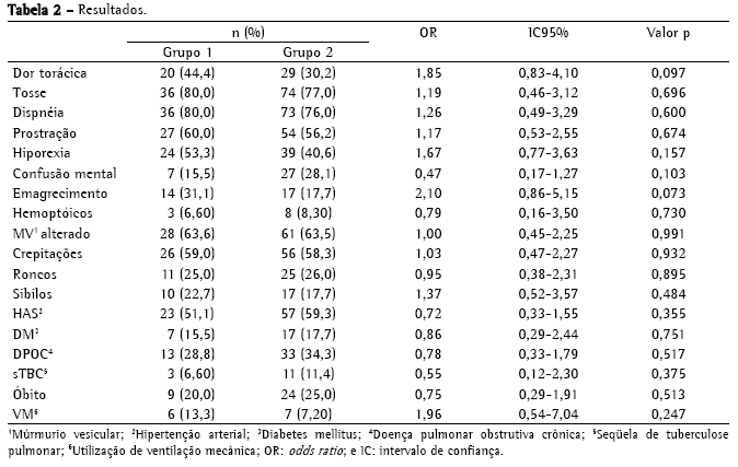 Percebe-se que não houve predomínio de nenhum sinal ou sintoma clínico, nem de achados auscultatórios e nem de prevalência de co-morbidades entre os grupos. Embora o odds ratio mostre alguma associação mais forte em certas variáveis (emagrecimento e confusão mental, por exemplo), os dados não demonstraram significância estatística (Tabela 2 e Figura 1).
