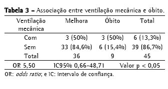 Dentre as variáveis pesquisadas, apenas a necessidade do uso de ventilação mecânica associou-se significativamente à ocorrência de óbito, independentemente do grupo de estudo (Tabela 3).