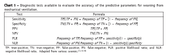 The PLR indicates the probability of a positive index resulting in successful weaning from MV, divided by the probability of the same index resulting in weaning failure.(16) In other words, the PLR expresses how many times it is more likely to obtain a positive result for a given index in patients who have been weaned from MV compared with those who have not.(16) The NLR indicates the probability of a negative index resulting in successful weaning from MV divided by the probability of the same index resulting in weaning failure.(16) In other words, the NLR expresses how many times it is more likely to obtain a negative result for a given index in patients who have not been weaned from MV compared with those who have.(16) An LR of 0.5-2.0 indicates that a parameter is mildly associated with the post-test probability of weaning success or failure. Values of LR of 2.0-5.0 and 0.3-0.5 are weakly but significantly associated with changes in the probability of weaning success or failure, respectively. Values of LR of 5.0-10.0 and 0.1-0.3 are more significantly associated with changes in the probability of weaning success or failure, respectively. Values of LR above 10 and below 0.1 are strongly associated with changes in the probability of weaning success or failure, respectively.(13) Chart 1 shows the diagnostic tests available, together with their respective formulas.