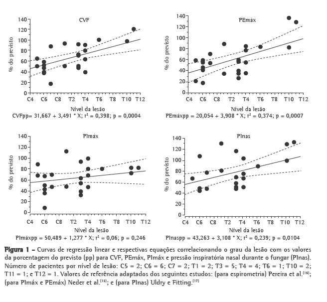 As complicações pulmonares são responsáveis por taxas elevadas de morbidade e mortalidade em pacientes tetraplégicos.(1) A lesão medular traumática (LMT) pode causar fraqueza e paralisia dos músculos respiratórios em graus variáveis, dependendo do nível e completude da lesão.(2,3) As investigações tradicionais usadas em pacientes com LMT são a espirometria e a determinação dos volumes pulmonares. Porém, vários fatores podem influenciar os resultados de PImáx e PEmáx,(4-7) e o valor da PImáx como um índice de capacidade inspiratória tem sido questionado.(6) Uma alternativa é determinar a pressão inspiratória nasal durante o fungar (PInas). Até o momento, não há estudos clínicos que avaliem o uso da PInas em pacientes com LMT. Porém, em pacientes com outras doenças neuromusculares, o valor prognóstico da PInas para a avaliação da força diafragmática mostrou-se comparável ao dos testes não-volumétricos e invasivos.(8-11) A determinação da PInas é um procedimento rápido, de fácil execução, e utiliza equipamento portátil. A fim de examinar a hipótese que a PInas pode detectar a redução da força dos músculos inspiratórios em pacientes com LMT, comparamos PInas, PImáx e outros parâmetros de função pulmonar em pacientes com LMT que apresentavam perda total da função motora, estratificando a amostra de acordo com o grau da lesão.