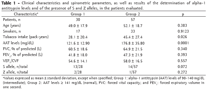 Only 2 patients presented AAT levels ≤ 89 mg/­dL, a number that is insufficient for statistical analysis. Both of those patients were SZ heterozygotes, were heavy smokers (18 and 20 pack-years) and had COPD. One of the two patients had chronic respiratory insufficiency and used home oxygen therapy, whereas the other had a history of frequent exacerbations and presented bronchiectasis on the tomography scan. Among the 89 patients, AAT levels were 90-140 mg/dL in 30 and ≥ 141 mg/dL in 57. These were designated Group 1 and Group 2, respectively.
