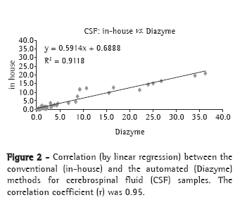 Pulmonology societies, including the Sociedade Brasileira de Pneumologia e Tisiologia (SBPT, Brazilian Thoracic Association),(20) recommend the determination of ADA activity in organic fluids, especially in PF and CSF.(21) Therefore, the standardization of reliable automated methods is needed in order to define the diagnosis more rapidly and favor TB treatment.