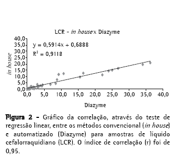 As Figuras 1 e 2 mostram os gráficos de correlação entre os dois métodos para amostras de LP e de LCR com diferentes níveis de atividade.