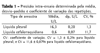 Os testes de precisão inter- e intra-ensaios foram satisfatórios com %CV adequados para as amostras de LP. No entanto, para as amostras de LCR, a %CV foi mais alta porque os níveis de atividade de ADA são menores em LCR do que nos outros líquidos cavitários. Além disso, trata-se de líquido muito menos rico em elementos protéicos e sabidamente apresenta diferenças enzimáticas e imunológicas mais instáveis, haja vista que para os mesmos níveis de atividade de ADA em LP (nível I) encontrou-se %CV maiores do que em LCR (níveis II e III).