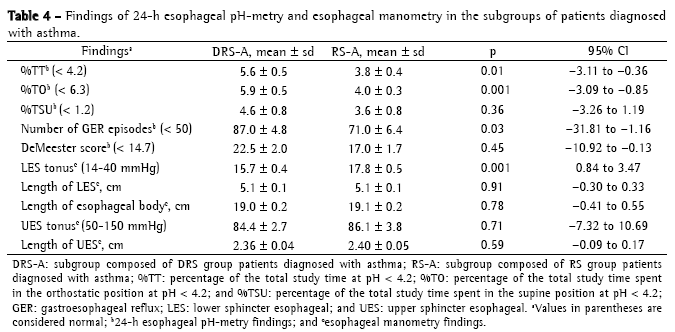 Therefore, the correlation between LES hypotonia and abnormal pH-metry test results was analyzed. In the RS and DRS groups, significant correlations were found for all such parameters. In the same comparison carried out among those who reported asthma, the correlation between hypotonia and time of exposure to acid in the supine position was found to be significant in the RS-A subgroup, which elevated to equally significant levels the percentage of the total time spent in exposure, as well as the DeMeester score. In the DRS-A group, reflux in the orthostatic position contributed significantly to elevating the total reflux time and, consequently, to elevating the final DeMeester score (Table 4). The use of bronchodilators apparently plays no role in these findings, since it has been demonstrated that there is no appreciable modification in the tonus of the LES,(29) and the that presence of the reflux does not depend on the use of bronchodilators.(30)