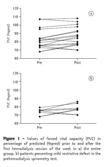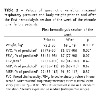 ProceduresThe patients were evaluated in terms of pulmonary function (spirometry), maximal respiratory pressures and weight. The evaluations were performed approximately one hour prior to and immediately after the first hemodialysis session of the week, the exception being body weight, which was measured approximately one hour prior to and immediately after the three weekly hemodialysis sessions.