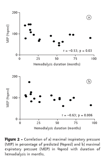 for example, the duration of hemodialysis (85 ± 41 months) was considerably shorter in our study (median, 27 months; IR, 14-55).Since we found duration of hemodialysis to present a significant negative correlation with MIP and MEP (Figure 2), the patients in the study conducted by Karacan et al.(4)would have actually been expected to exhibit a more pronounced decrease in MIP. These facts suggest that, although there were no acute intradialytic changes in respiratory muscle function in patients on hemodialysis for a shorter period, with the evolution of the disease and the longer treatment period, patients present a progressive decrease in respiratory muscle strength. This information, which has never been reported in the literature, should encourage the implementation of training programs to prevent atrophy and loss of muscle strength in this population, positively influencing their clinical evolution.(20) The positive effects of physical activity, such as stress reduction, anxiety reduction and hostility reduction, have already been demonstrated.(21) However, the scientific literature still lacks studies involving interventions specifically aimed at evaluating muscle strength and exercise capacity in patients on hemodialysis.