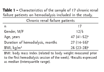 MethodsSampleA convenience sample of 17 CRF patients was studied. The characteristics of the sample are shown in Table 1. In addition to being diagnosed with CRF, another inclusion criterion was absence of chronic respiratory, cerebrovascular or rheumatic disease, as reported by the patient in the initial interview performed prior to the evaluations. The exclusion criteria were hemodynamic instability on the day of the evaluation, presence of severe cardiac abnormalities (based on recent electrocardiographic evaluations documented in the medical charts) and noncooperation with test procedures. The patients underwent hemodialysis three times a week at a hemodialysis facility in the city of Londrina, located in the state of Paraná. The hemodialysis sessions of the patients studied occurred either on a Monday/Wednesday/Friday schedule or on a Tuesday/Thursday/Saturday schedule, being, in both cases, designated first, second and third sessions, respectively. Therefore, prior to the first hemodialysis session of the week, there was a three-day interdialytic period, whereas, prior to the other two weekly sessions, there was a two-day interdialytic period. The study was approved by the Ethics in Human Research Committee of the State University of Londrina - University Hospital. All participating patients formally agreed to submit to the study procedures by giving written informed consent prior to inclusion.
