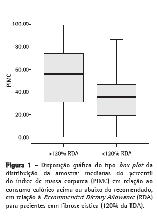 Na Figura 1, demonstra-se que os pacientes que ingeriam calorias acima de 120% da RDA tinham mediana de PIMC com valor de 56; já os que ingeriam calorias abaixo dessas recomendações, mantinham uma mediana de PIMC igual a 34,9.