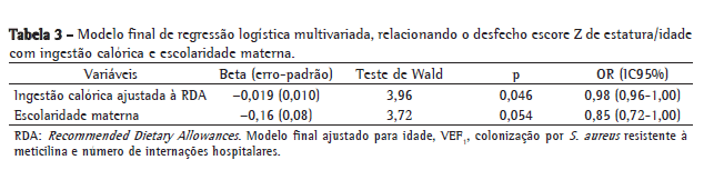 O aumento de um percentual, em relação à RDA, de ingestão calórica, diminui em 2% a chance de haver déficit de estatura (OR = 0,98; IC95%: 0,96-1,00), ajustando-se para idade, VEF1, colonização por MRSA e número de internações hospitalares (Tabela 3). A escolaridade materna parece influenciar o indicador nutricional relacionado com o crescimento, ou seja, parece haver um efeito protetor da maior escolaridade da mãe sobre o indicador nutricional relacionado ao crescimento. Entretanto, na análise multivariada, essa associação permaneceu limítrofe para a significância estatística (p = 0,054).