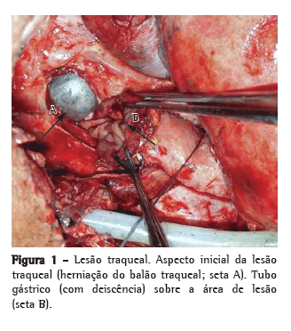 Foi realizada uma nova toracotomia, pela qual se observou uma grande lesão comprometendo aproximadamente 4 cm da parede membranosa da traqueia, onde se observava o balão do tubo orotraqueal, herniado pela lesão traqueal, e deiscência da anastomose esofagogástrica (Figura 1). A lesão corrigida do brônquio principal esquerdo encontrava-se integra.