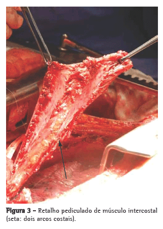 Diante da falta de condições de sutura da parede membranosa da traqueia e da gravidade do paciente para a realização de traqueoplastia, optamos pela correção com o uso de retalho pediculado de músculo intercostal (dois segmentos intercostais; Figuras 2 e 3), o qual foi ancorado nas paredes cartilaginosas da traqueia, corrigindo o defeito da parede membranosa da mesma. Foi realizado o sepultamento do tubo gástrico na cavidade pleural e esofagostomia cervical.