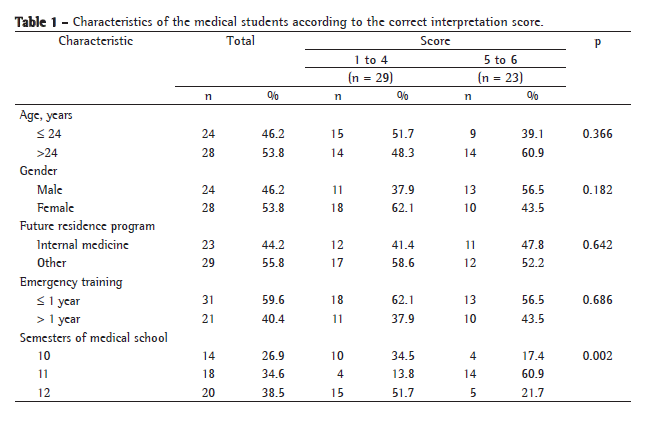 the only factor associated with higher scores in the interpretation of chest X-rays was the year of study. As demonstrated in earlier studies, our results suggest that training might play a role in improving the performance of medical students in interpreting chest X-rays.(5,7)