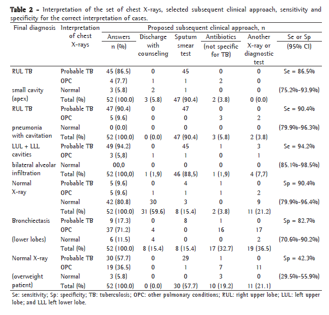 As shown in Table 2, the proportion of correct diagnoses of TB based on the chest X-rays was high. Sensitivity was, respectively, 86.5%, 90.4%, and 94.2% according to the severity of the disease (minimal, moderate and extensive). The coherence between the correct interpretation of the chest X-rays of TB patients and a suitable clinical approach was 100% (minimal and moderate) and 91.8% (extensive).