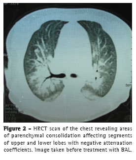 In the second bronchoscopy, there was a small quantity of diffuse opalescent secretion. A BAL was performed in the left lower lobe, and analysis of the BAL fluid revealed numerous lipid-laden cells and few structures suggestive of fat droplets. In the third procedure, a BAL was performed in the right upper lobe, structures suggestive of fat droplets and numerous lipid-laden cells having been found. The patient recovered well; she gained appreciable weight and became asymptomatic, radiological normalization being complete.