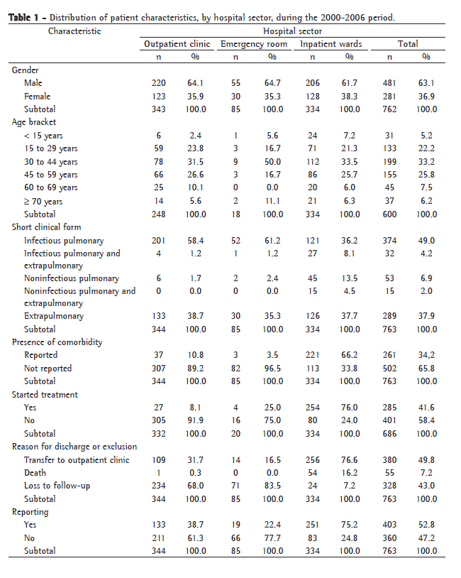 In the evaluation of the reasons for discharge, we observed that, in 68.0% of the outpatient cases and in 83.5% of the emergency room cases, there were no hospital records of referral for treatment at another facility, which would be essential, since tuberculosis is not treated at the hospital under study. Therefore, those cases can be characterized as having been lost to follow-up. Of the patients lost to follow-up, 49.8% presented with infectious pulmonary tuberculosis and 48% presented with exclusively extrapulmonary tuberculosis.