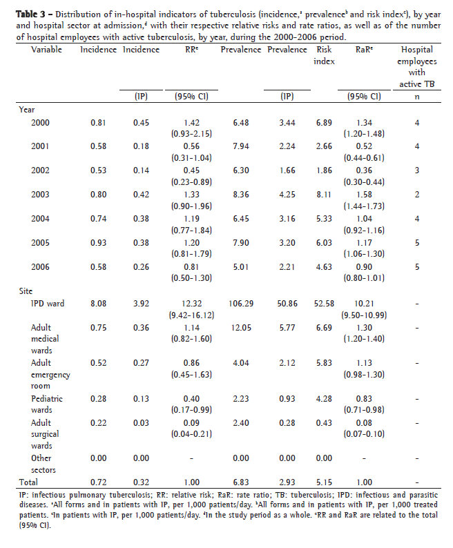 The results obtained for the in-hospital indicators (incidence, prevalence and risk index) in this study demonstrate great annual variability, which is as expected for rare events analyzed in short time series. To date, however, there have been no studies of their use as indicators of nosocomial exposure assessment. Nevertheless, studies of the occurrence of tuberculosis in hospital populations have identified prevalences ranging from 0.70% to 5.03%.(23,24) Furthermore, none of the studies cited here made reference to the occurrence of active tuberculosis among their health care professionals.
