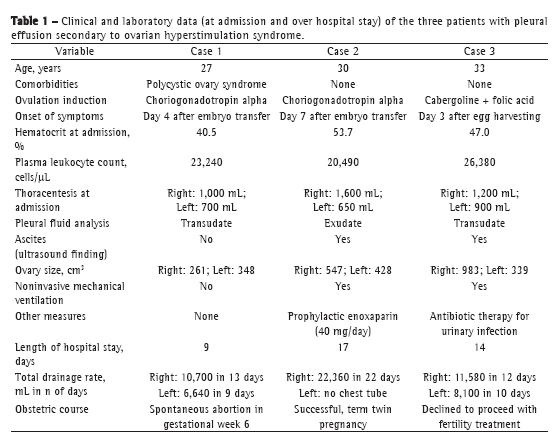 Case reportsThree patients, ranging in age from 27 to 33 years, were hospitalized because of progressive dyspnea and massive bilateral pleural effusion. All patients were receiving ovulation induction therapy for in vitro fertilization. Two of the patients had already undergone embryo transfer. The three patients presented with ovarian hypertrophy and various follicular cysts, with or without ascites. Pleural effusion was initially treated with bilateral thoracentesis (in two of the patients) or paracentesis (in one) for symptom relief. However, because of early recurrence of pleural effusion, drainage was subsequently performed with a pigtail catheter. As can be seen in Table 1, the daily output was very high. Nevertheless, no specific measure other than aggressive fluid resuscitation was attempted in order to manage such a high drainage rate. The patients received intravenous injection of crystalloids (2,000-4,000 mL/day) and 20% human albumin solution (200-300 mL/day) for an average of 7 days. Two of the patients required noninvasive mechanical ventilation. The three patients responded favorably to the treatment given, and the length of hospital stay ranged from 9 to 17 days (in two cases, the chest tubes were removed at outpatient clinics, after the patients had been discharged). Further clinical and laboratory information is shown in Table 1.