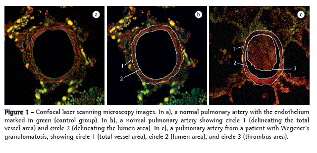 As características da GW, que é uma das vasculites associadas ao antineutrophil cytoplasmic antibody (ANCA, anticorpo anticitoplasma de neutrófilos), incluem inflamação/necrose de artérias de pequeno e médio calibre e apresentações clínicas graves, como insuficiência renal aguda e hemorragia alveolar.(5-7) Recentemente, fenômenos tromboembólicos também surgiram como um novo enigma clínico na GW.(6,8,9) Entretanto, houve poucas descrições histopatológicas de trombos na microcirculação pulmonar de vasculite associada ao ANCA, provavelmente devido à falta de conhecimento a respeito desse achado histopatológico, já que a questão dos fenômenos tromboembólicos na GW não foi levantada até 2005.(8,10-12) Portanto, conduzimos este estudo, baseado em microscopia confocal por varredura a laser, com o objetivo de determinar a presença de trombos de fibrina e quantificá-los em artérias pulmonares de pequeno e médio calibre.