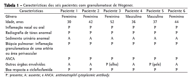 Universidade de São Paulo, em São Paulo (SP), para diagnóstico de doenças pulmonares/sistêmicas e que preenchiam os critérios clínicos e patológicos para o diagnóstico de GW.(5) A busca identificou seis pacientes com GW, cuja TC de tórax revelou nódulos/massas não escavados, porém nenhum achado que sugerisse a presença de hemorragia alveolar. Além disso, os pacientes não apresentavam comprometimento renal, o que era esperado, já que, caso tivessem apresentado alterações renais, a biópsia teria sido feita nos rins, e não nos pulmões, uma vez que os riscos de morbidade e mortalidade associados a biópsias pulmonares são muito maiores que aqueles associados a biópsias renais. Ademais, os pacientes não estavam recebendo prednisona/imunossupressores antes da biópsia pulmonar.