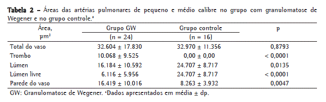 Objetivo: A granulomatose de Wegener (GW) pode causar dano nas células endoteliais e fenômenos tromboembólicos. Entretanto, poucos estudos analisaram a microcirculação pulmonar - artérias pulmonares de pequeno/médio calibre (APPMC) - em pacientes com GW. O objetivo deste estudo foi quantificar trombos de fibrina em amostras de APPMC de pacientes com GW. Métodos: Analisamos 24 APPMC de seis pacientes com GW e 16 APPMC de quatro pacientes controles sem WG. Utilizamos CD34 para a marcação do endotélio em todas as amostras e microscopia confocal a laser para detectar trombos de fibrina intravasculares. Calculamos a área total do vaso, a área livre do lúmen e a área trombótica. Resultados: A média da área total do vaso foi similar no grupo GW e no grupo controle (32.604 µm2 vs. 32.970 µm2, p = 0,8793). Trombos foram identificados em 22 das 24 APPMC (91,67%) no grupo GW, e em nenhuma do grupo controle (p < 0,0001; OR = 297 (IC95%: 13,34-6.612). A média da área trombótica foi maior no grupo GW do que no grupo controle (10.068 µm2 vs. 0.000 µm2, p < 0,0001). Em contraste, a média da área livre do lúmen foi menor no grupo GW que no grupo controle (6.116 µm2 vs. 24.707 µm2, p < 0,0001). Conclusões: A microscopia confocal a laser mostrou uma associação significante entre trombose microvascular pulmonar e GW. Isso sugere um possível papel da trombose microvascular na fisiopatologia da GW pulmonar, evocando o potencial benefício da anticoagulação na GW pulmonar. Entretanto, novos estudos são necessários para confirmar nossos achados, assim como um ensaio clínico randomizado a fim de testar o papel da anticoagulação no tratamento de pacientes com GW pulmonar.