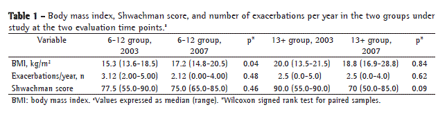 However, this patient was a weightlifter, and the weight gain observed was due to an increase in muscle mass. The BMI Z score for the group formed by patients younger than 19 years of age was analyzed, and there was no significant difference between the medians (−0.4 in 2003 vs. −0.39 in 2007; p = 0.51). Although the SS was lower at the second evaluation time point than it was at the first evaluation time point, in both groups, the difference was not statistically significant. In the 13+ group, however, there was a borderline significant decrease in the SS. There were no significant differences between the two time points in terms of the number of exacerbations, and the patients who presented with colonization by P. aeruginosa in 2003 also did so in 2007: 1 patient in the 6-12 group and 6 in the 13+ group. These data are summarized in Table 1.