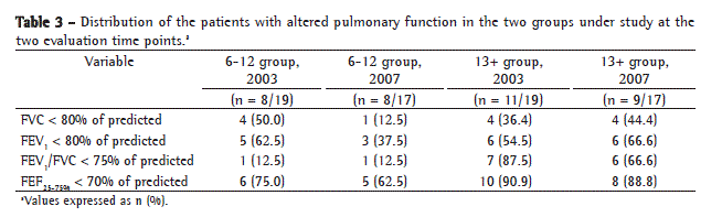 The median FVC, FEV1 , and FEF25-75% (in percentage of predicted) increased in the 6-12 group during the study period. However, this increase was statistically significant for FVC only, being borderline significant for FEV1 . In the 6-12 group, the number of patients with changes in volumes and flows decreased. However, the number of patients with changes in the FEV1 /FVC ratio remained the same. In the 13+ group, all medians decreased. However, the difference was not statistically significant. The number of patients with changes in FVC and FEV1 remained the same. However, the number of patients with changes in FEF25-75% and in the FEV1 /FVC ratio decreased when the following cut-off points were considered: 80% of the predicted values for FVC and FEV1 ; 70% of the predicted value for FEF25-75% ; and 75% of the predicted value for the FEV1 /FVC ratio. These data can be seen in Tables 2 and 3.