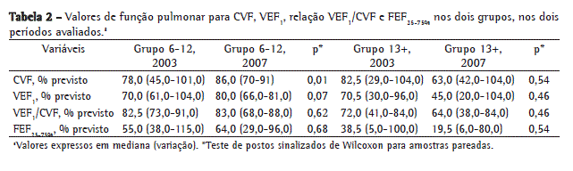 Observou-se um aumento das medianas de CVF, VEF1 e FEF25-75%, em porcentagem do previsto, no grupo 6-12 durante o período de estudo, mas esse aumento só foi estatisticamente significativo para a CVF, sendo limítrofe para o VEF1. Observou-se uma diminuição do número de pacientes com volumes e fluxos alterados no grupo 6-12, exceto para a relação VEF1/CVF, que se manteve. No grupo 13+, houve queda de todas as medianas, mas a diferença também não foi significativa. O número de pacientes com CVF e VEF1 alterados se manteve, mas houve uma diminuição do número de pacientes com FEF25-75% e relação VEF1/CVF alterados, considerando-se, como pontos de corte, 80% do previsto para CVF e VEF1, 70% do previsto para o FEF25-75% e 75% do previsto para a relação VEF1/CVF. Esses dados podem ser vistos nas Tabelas 2 e 3.