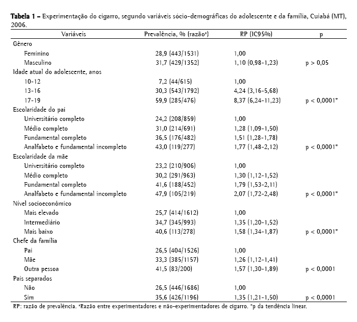 A Tabela 1 apresenta as variáveis sócio-demográficas dos adolescentes e de suas famílias em relação à experimentação do cigarro. Nota-se que não houve diferença entre os gêneros para a experimentação do cigarro. À medida que o adolescente fica mais velho, maior o risco de experimentar o cigarro.