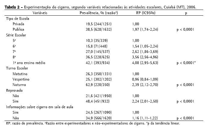 Em relação às atividades escolares e a experimentação do cigarro, verificou-se que os alunos que estudam em escolas públicas têm maior risco de experimentar o cigarro do que aqueles que estudam em escolas privadas. Além disso, a probabilidade de experimentar cigarros aumenta linearmente com o avanço do adolescente para as séries subseqüentes. Da mesma forma, estudar no período noturno, já ter sido reprovado e não ter recebido nenhuma informação sobre cigarro em sala de aula aumentam a probabilidade de o adolescente experimentar o cigarro (Tabela 2).