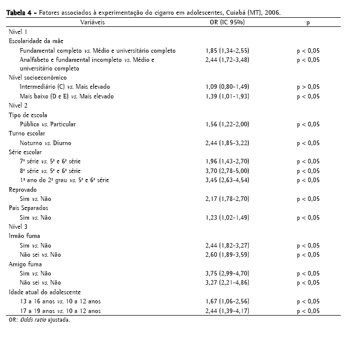 Na Tabela 4 estão os resultados da análise de regressão logística hierarquizada. Filhos cujas mães têm até o nível fundamental completo apresentam maior chance de experimentar o cigarro do que aqueles que as mães têm escolaridade igual ou maior do que o nível médio. Adolescentes pertencentes ao nível socioeconômico D e E (mais baixo) têm uma chance 39% maior de experimentar o cigarro do que aqueles pertencentes a famílias de nível socioeconômico mais elevado. No nível 2 observou-se que alunos da escola pública, com pais separados, estudando no período noturno e nas séries finais do ensino fundamental e no 1º ano do ensino médio têm maior chance de experimentar o cigarro do que aqueles que estudam em escola privada, cujos pais não são separados, que estudam no período diurno e que estão na 5ª e 6ª série do ensino fundamental. No nível 3 foram incluídas as variáveis consideradas mais próximas do desfecho. Nota-se que quando o jovem tem irmão ou amigo que fuma, a chance de experimentar o cigarro é duas vezes maior para os que têm irmãos fumantes, e mais do que o triplo para aqueles que têm amigos fumantes, quando comparados aos que não têm nem amigos nem irmãos que fumam. Da mesma forma, à medida que o adolescente fica mais velho, é maior a chance de experimentar o cigarro.
