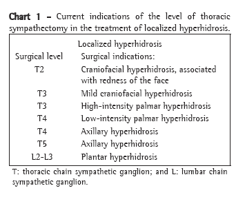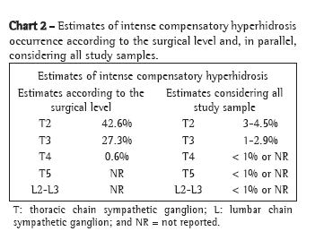 We emphasize that, aiming at eliminating the possibility of occurrence of intense CH, there are surgeons that defend surgery in the T4 level, both for axillary and palmar hyperhidrosis, reporting excellent results in efficacy and zero incidence of hyperhidrosis (Chart 2).(7,8)