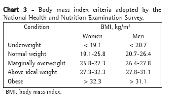 The BMI value indicates whether an adult is overweight, obese or under the weight considered healthy. The criteria adopted by the National Health and Nutrition Examination Survey II are more detailed than those used by the World Health Organization (Chart 3).