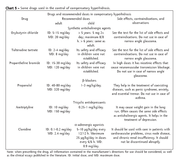 Several anticholinergic drugs currently available are synthesized in laboratories. Oxybutynin chloride has demonstrated promise. According to various authors, the use of anticholinergic drugs, especially oxybutynin chloride, can be of great help in the control of primary hyperhidrosis or in CH when patients tolerate their side effects. For many patients, a decrease in reflex sweating levels after treatment with anticholinergic drugs makes the discomfort acceptable, especially on hot days.