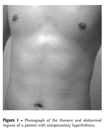 Occurring in the postoperative period of thoracic sympathectomy surgery, CH is characterized by mild to profuse sweating that is typically symmetric. It affects body regions unaffected by the sympathectomy and that did not previously present abnormal sweating, such as the dorsal region, abdomen and, at times, the lower limbs.