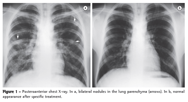 We report the case of a 16-year-old male patient who reported that, one week after having swum in a pond, he had experienced fever and epigastric pain followed by diarrhea, vomiting, and joint pain. The patient also reported that, five days before seeking medical attention, he had experienced transitory facial exanthema and dry cough. The time elapsed between the onset of the symptoms and the first medical appointment was 20 days. The results of the laboratory tests performed during his hospital stay were as follows: leukocyte count of 16,500-26,700 cells/mm3, the proportion of eosinophils ranging from 23% to 66%; and positive parasitological stool examination (PSE) results for S. mansoni eggs. Posteroanterior chest X-rays revealed various nodular opacities that had ill-defined borders and were diffusely distributed throughout the lungs. The opacities disappeared after specific treatment (Figures 1a and 1b). An HRCT scan of the chest showed the pulmonary lesions in greater detail and revealed various nodules that were diffusely distributed throughout the lung parenchyma, predominantly in the cortical regions, and measured, on average, 10.0 mm; most of the nodules showed a weak halo surrounded by ground-glass attenuation (Figure 2). The patient was treated with three 1,050-mg doses of praziquantel. At the first outpatient follow-up visit, one month after discharge, the patient was asymptomatic, and the laboratory test results were as follows: leukocyte count of 7,850 cells/mm3 (eosinophils, 17%); and positive PSE results for S. mansoni eggs. At the second outpatient follow-up visit, two months after the treatment, the leukocyte count was 6,680 cells/mm3 (eosinophils, 9%), and the PSE results were negative for S. mansoni eggs.
