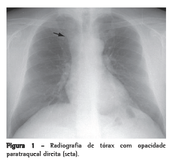 Relato de casoHomem de 50 anos, fumante, 30 anos-maço, vendedor de automóveis, com antecedentes de hipertensão arterial e dislipidemia. Medicado habitualmente com sinvastatina, 20 mg; valsartan, 80 mg; lansoprazol, 30 mg; e brotizolam, 0,25 mg. Orientado para a consulta externa com especialista em pneumologia por achado de lesão paratraqueal direita com alargamento do mediastino superior em radiografia de tórax de rotina (Figura 1).
