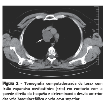O doente apresentava-se assintomático e sem alterações de relevo ao exame físico-auscultação pulmonar e saturação periférica de oxigênio normais e sem turgescência venosa jugular a 45°. Não apresentava alterações no estudo da função pulmonar, e o exame eletrocardiográfico era normal. Foi efetuada tomografia computadorizada torácica, que revelou uma lesão tumoral mediastínica, em localização paratraqueal direita, com 4,5 cm de diâmetro, em contato com a parede direita da traquéia e determinando desvio anterior das veias braquiocefálica e cava superior. A massa apresentava contornos regulares, baixa densidade espontânea, homogênea e sem realce após administração de contraste (Figura 2).